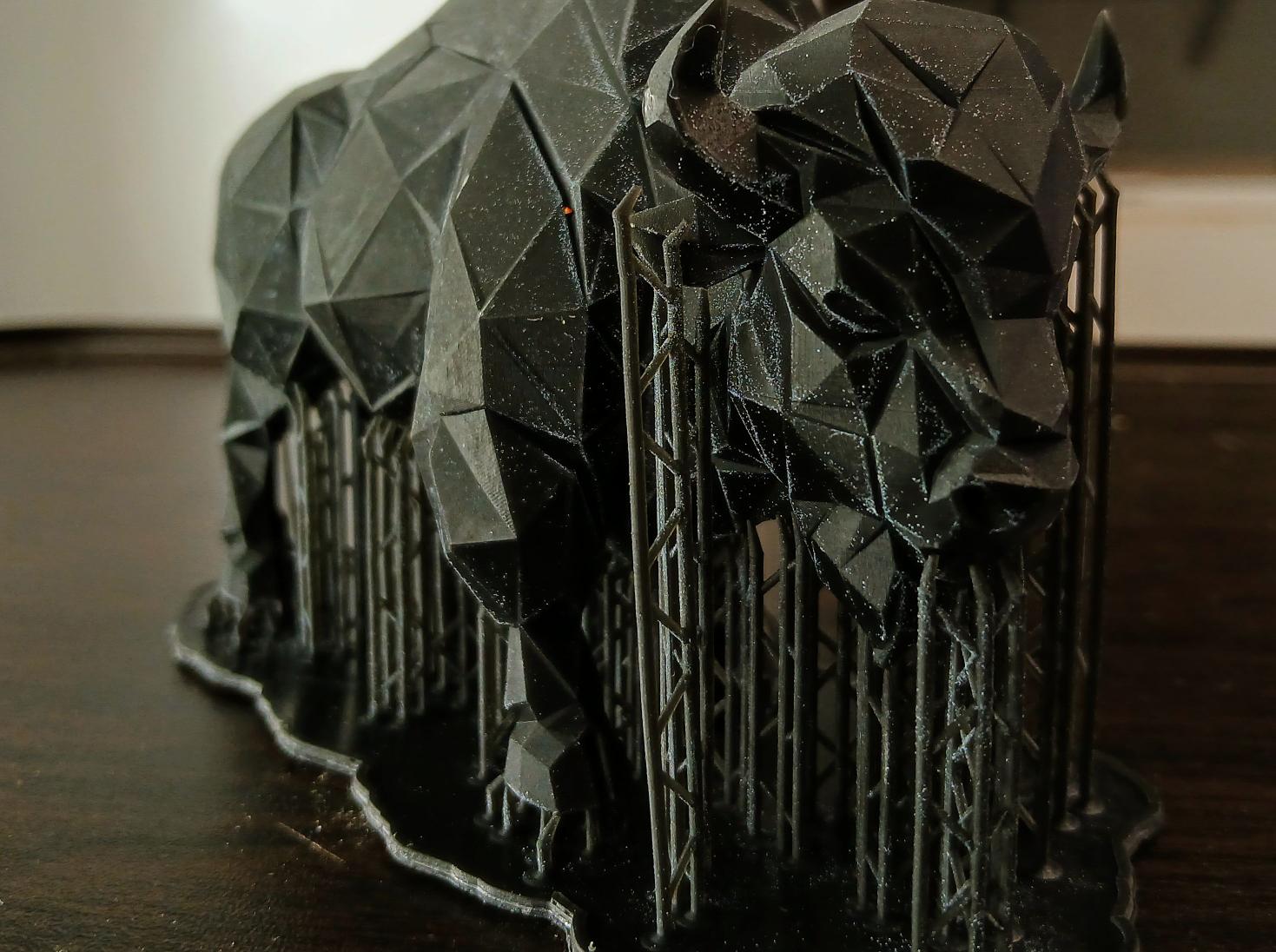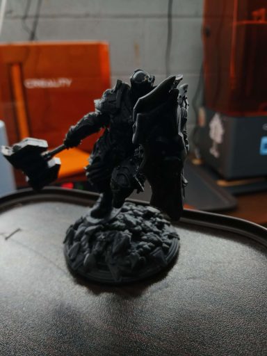 This form of printing is close to four times the resolution of FDM printing (see below). It uses an ultraviolet screen to cure an incredibly thin layer of liquid resin. This resin then sticks to the previous layer. The semi-solid model is washed, then cured on a UV turntable. An average print consists of around 700-800 layers.